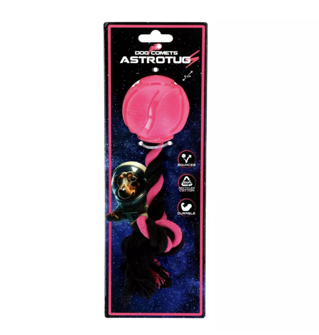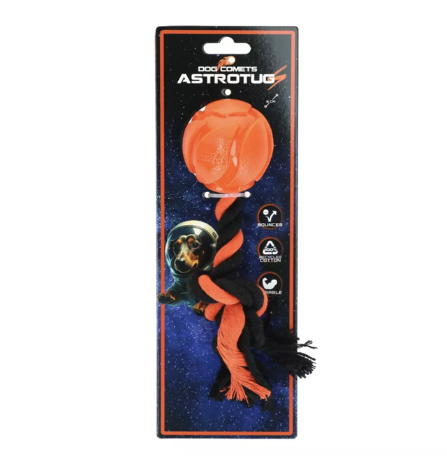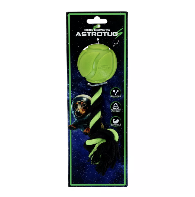 Dog Comets AstroTug ist ein Hundespielzeug, das Ball und Seil für Hunde kombiniert, die gerne apportieren und spielen. Dieses Spielzeug eignet sich ideal für aktives Spiel, bei dem Werfen und Zurückbringen im Mittelpunkt stehen.