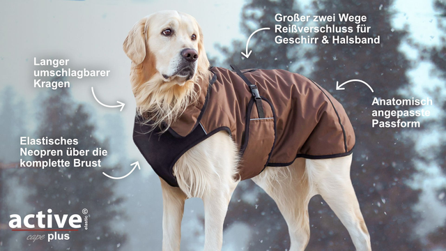 Das Außenmaterial aus 100% Polyester besitzt eine hoher wasserabweisende Beschichtung, die Wind- und Wasserdichtigkeit, sowie die Atmungsaktivität gewährleistet. Das gelammte Fleecefutter + zusätzliche Wattierung sorgt für mehr Wärme als bei dem active© cape light. Die Hauptmuskelgruppen und der empfindliche untere Brustkorb werden bei schlechtem Wetter trocken gehalten, so dass Ihr Hund - gut verpackt - immer Spaß an der Bewegung in der Natur hat. Das Cape kann schnell an- und ausgezogen werden. Somit ist es ideal, um den Hund auch vor dem Training, nach dem Training und in Pausenzeiten gut zu schützen.