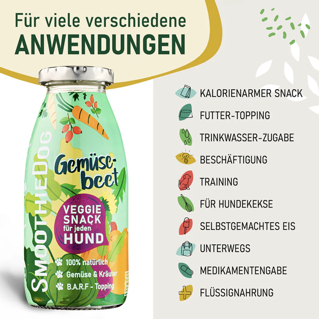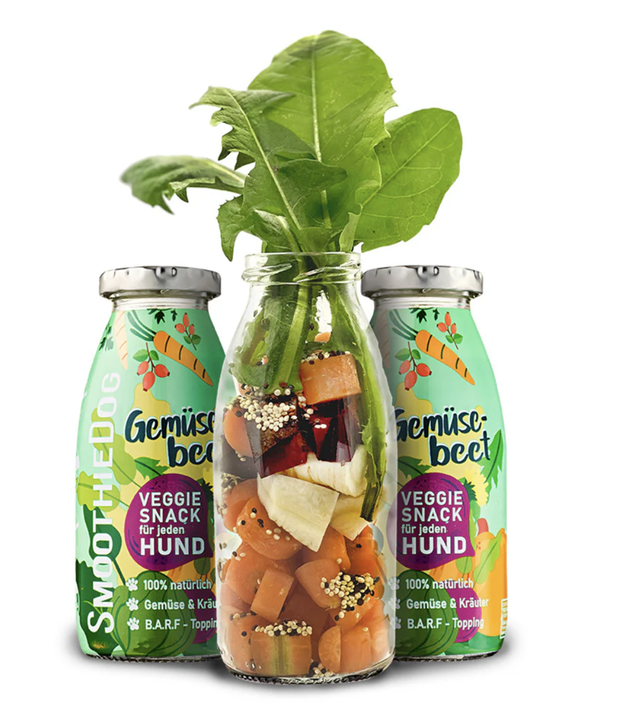 SmoothieDog „Gemüsebeet“ ist der vegetarische Hundesmoothie voller natürlicher Nährstoffe! Karotten, Kürbis und Rote Bete fördern Verdauung, Immunsystem und Fellgesundheit. Leinsamen schützen Magen und Darm, während Hagebutte mit viel Vitamin C die Abwehrkräfte stärkt. Kurkuma wirkt antibakteriell, Löwenzahn unterstützt Magen, Nieren und Galle, und Wurzelpetersilie stärkt Knochen und Zähne.