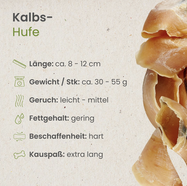 Ob als Leckerli für zwischendurch oder zur ruhigen Selbstbeschäftigung – Kalbshufe sind eine hochwertige Alternative zu herkömmlichen Kauartikeln. Sie sind frei von künstlichen Zusatzstoffen und bestehen zu 100 % aus Kalb, was sie auch für ernährungssensible Hunde attraktiv macht.