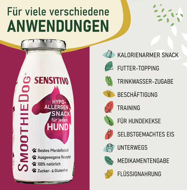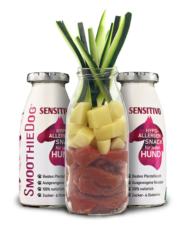 SmoothieDog „Sensitivo“ ist speziell für Hunde entwickelt, die auf herkömmliches Fleisch allergisch reagieren. Pferdefleisch bietet eine gut verträgliche, nährstoffreiche Alternative mit hochwertigem Protein, B-Vitaminen, Selen und Zink zur Unterstützung der Gesundheit. Pastinake fördert die Darmflora, stärkt das Immunsystem und unterstützt die Verdauung. Zucchini regt den Magen-Darm-Trakt an, stärkt die Sehkraft und kann zur Krebsvorbeugung sowie zum Schutz von Herz und Kreislauf beitragen.
