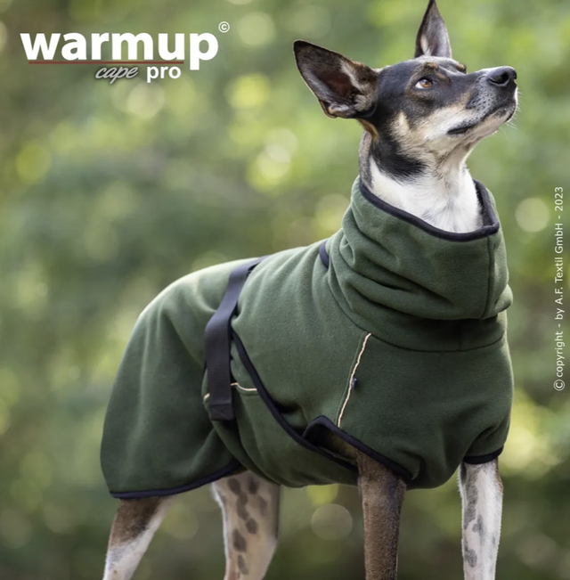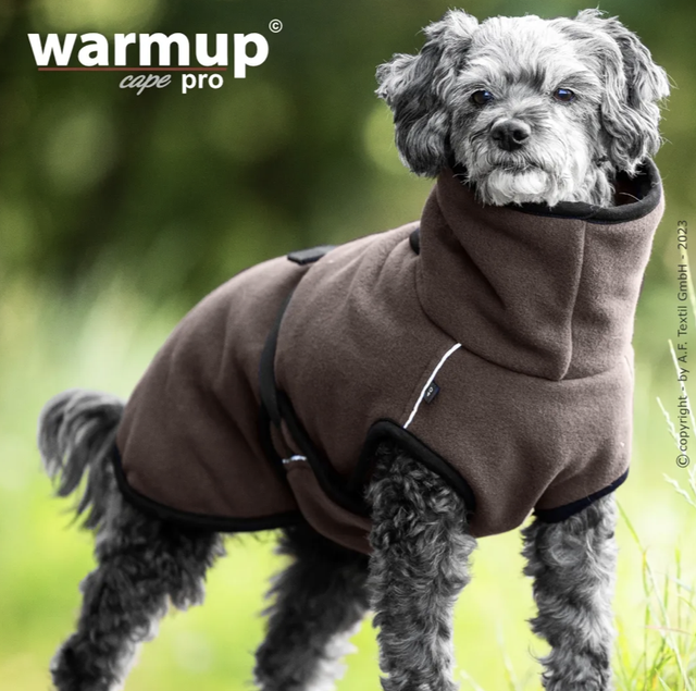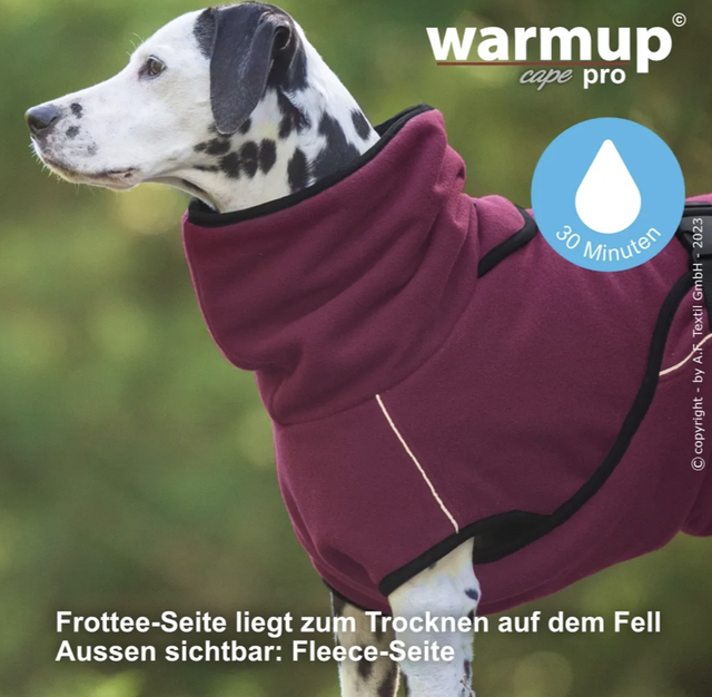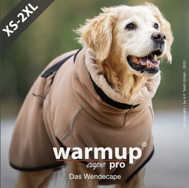 Das "Warmup© Cape Pro“ mit einen angeschnittenen Bauchlatz und großem Kragen, besteht aus zwei verschiedenen Materialien und kann nach Bedarf gewendet werden. Das Innenfrottee (100% Baumwolle) nimmt die Feuchtigkeit auf und führt vom Hund weg. Nach dem Wenden wärmt das kuschelige Fleece (außen) den Hund zuverlässig und umschließt und wärmt auch die empfindliche Halspartie.